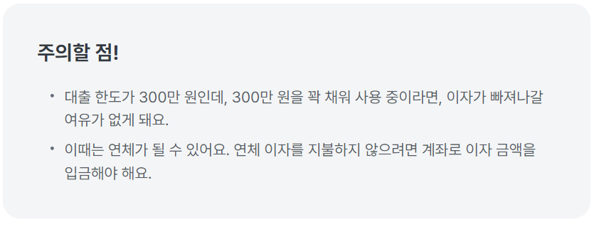 - 연체 금리: 만약 이자가 미납되면 연체 기간 동안 **기본 대출 금리 + 3%**의 연체 금리가 적용됩니다.
